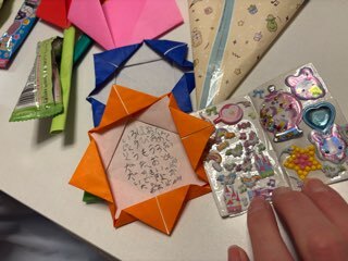 手作りの花束やシール帳。