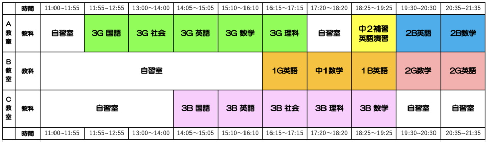 3年G組 11:55~17:15 国語・数学・英語・理科・社会