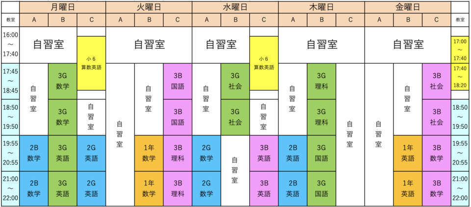3年G組 月・水 18:50~22:00、木 17:45~22:00