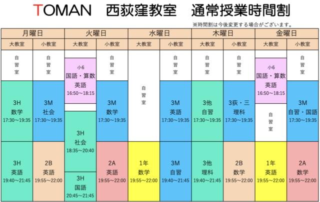1学期の時刻では運動部の生徒さんが間に合わなくなるため、終了時刻が遅くなりますが何卒ご了承ください。
